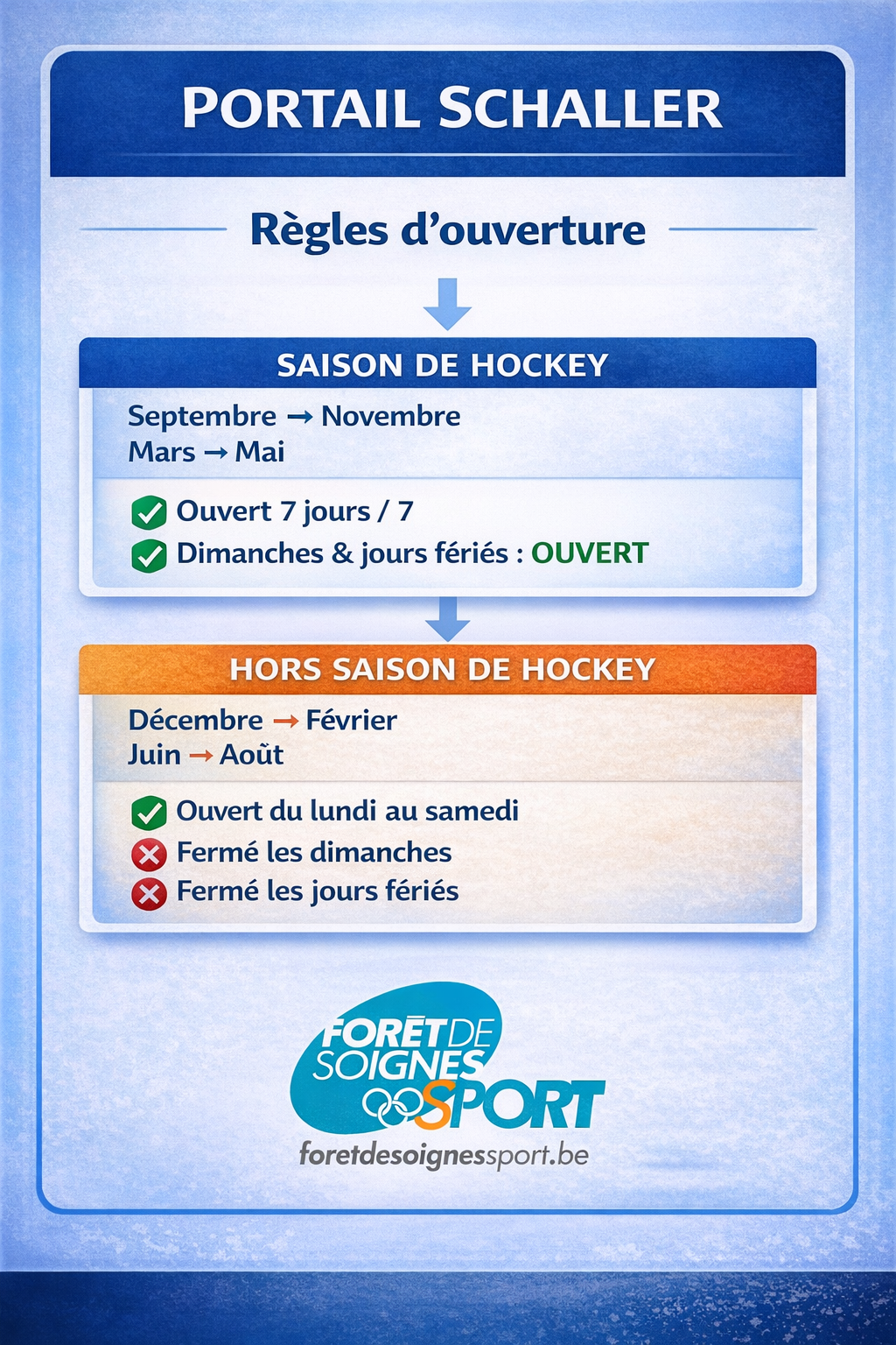 - Hors saison de hockey : Le portail est ouvert en semaine, mais sera fermé les dimanches et jours fériés.